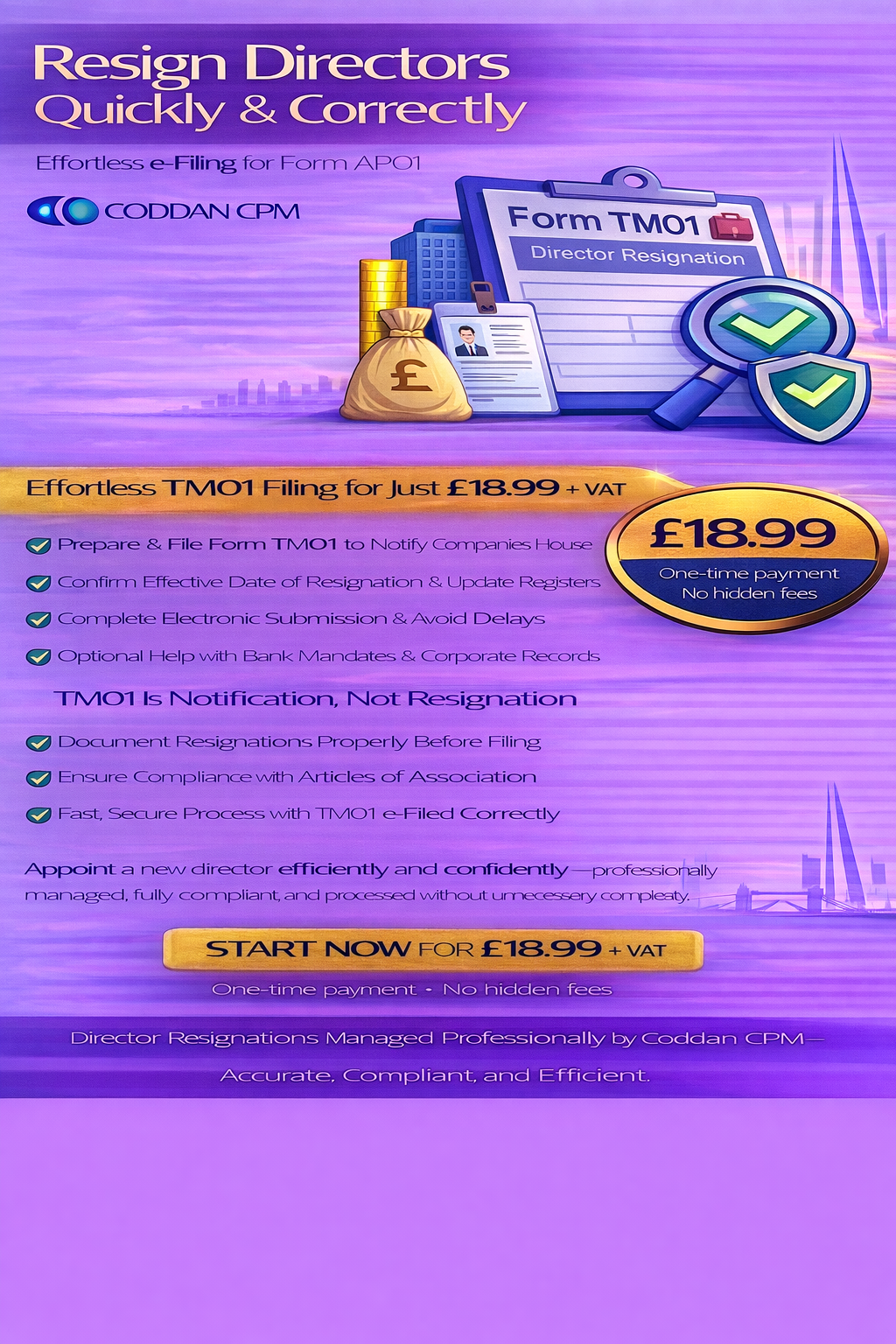 - Ensure a smooth transition by letting us handle the TM01 form to officially remove your departing director from company records. Quick and hassle-free service.