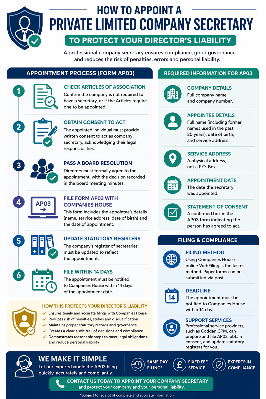 - Appointing a company secretary, can help you avoid late filing penalties and ease the administrative burden on directors. Discover the benefits today!