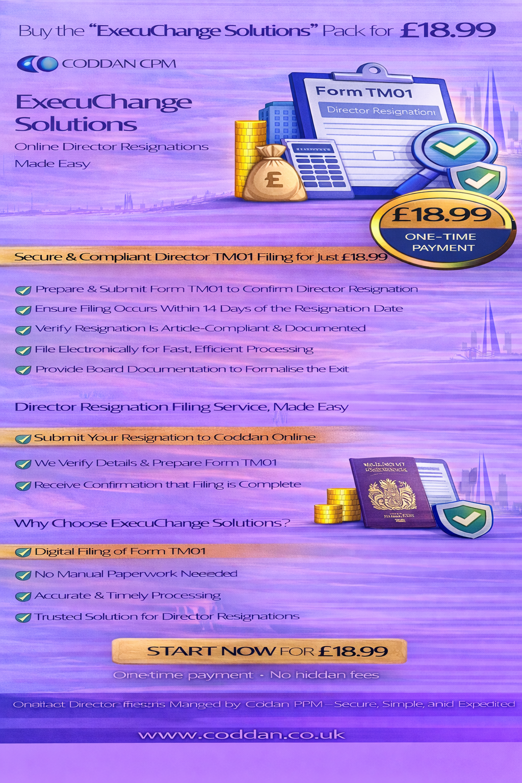 Buy Now When a director decides to resign or step down, the process must be handled correctly to ensure compliance with UK company law. Filing Form TM01 is the statutory requirement to notify UK Companies House of a director’s resignation, and it must be submitted within 14 days of the effective date. Coddan CPM offers a digital TM01 bundle designed to manage director resignations quickly, accurately, and in full compliance. Whether you are voluntarily stepping down, relinquishing your directorship, or formally vacating office, our streamlined electronic filing service ensures the notification is prepared and submitted without delay. It is important to understand that filing TM01 is a notification—not the act of resignation itself. The resignation must first comply with the company’s Articles of Association and any applicable director service agreement.