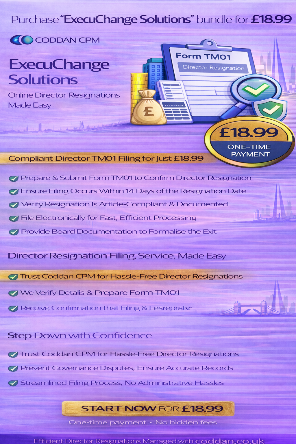 Buy Now Resigning as a director must be handled correctly to ensure full compliance with UK company law. When stepping down, vacating office, or making a voluntary departure, Form TM01 must be filed with Companies House within 14 days of the effective resignation date. Coddan CPM provides a streamlined electronic TM01 filing service designed to make director resignations clear, compliant, and professionally managed. Whether you are relinquishing your directorship voluntarily, demitting office due to restructuring, or formally standing down from board duties, we prepare and submit the required notification swiftly and accurately. It is important to note that TM01 is a statutory notification—not the act of resignation itself. The resignation must first comply with the company’s Articles of Association and any relevant service agreement.