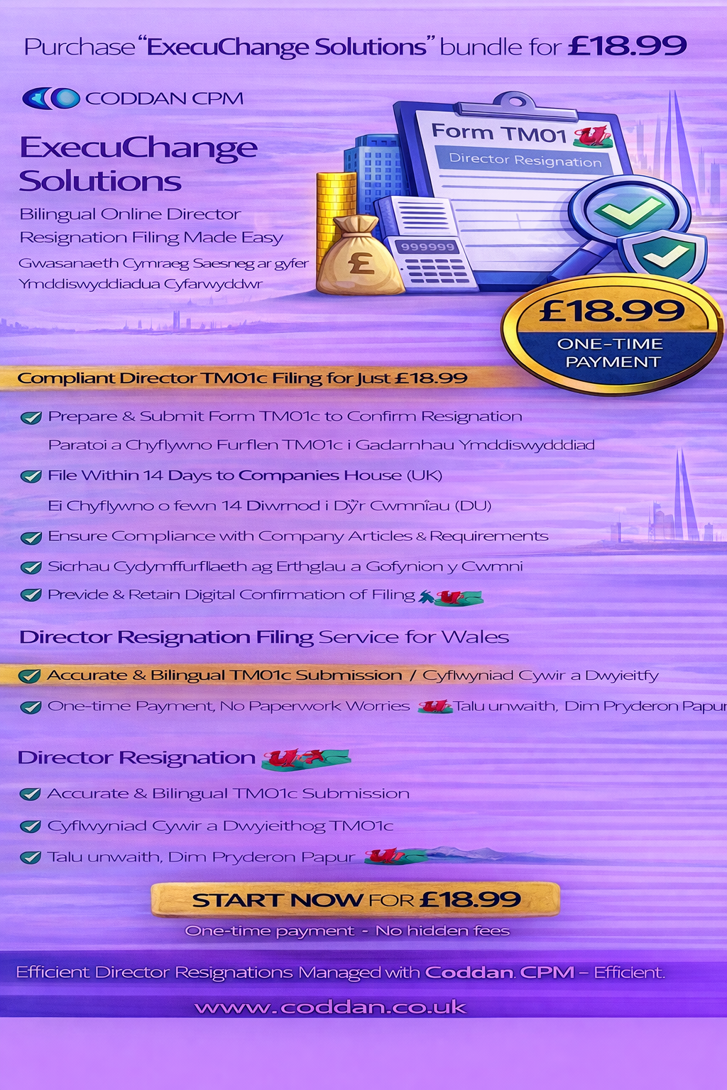 Buy Now When a director resigns or steps down from a Welsh-registered company, the change must be formally notified using Form TM01c and filed with UK Companies House within 14 days. Whether the departure is voluntary, part of a board reshuffle, or due to removal or disqualification, accurate and timely filing is essential to maintain compliance. Coddan CPM offers a streamlined electronic TM01c filing service tailored for companies registered in Wales. Our bilingual English and Welsh support ensures clarity throughout the process, helping directors and companies manage resignations, standing down, or vacating office without administrative confusion. It is important to note that filing TM01c is a statutory notification—it does not itself create the resignation. The resignation or removal must first comply with the company’s Articles of Association and any relevant service agreements.