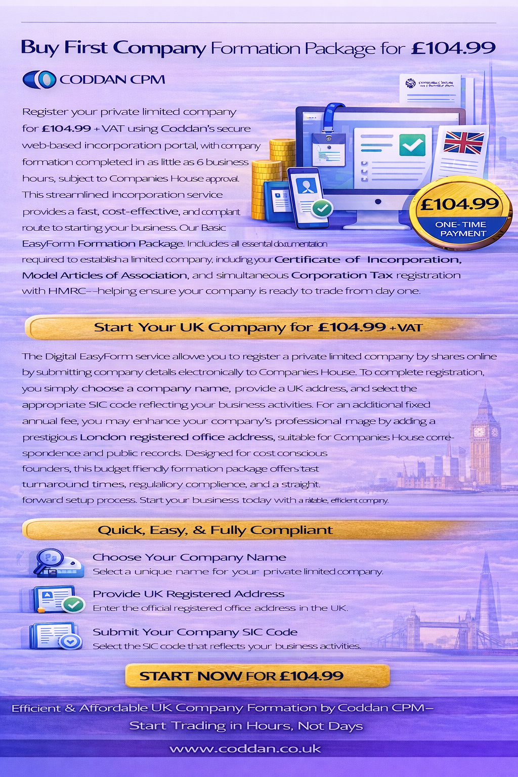 Choose one of our company formation packages and use the “Web-Incorporation Service” for simple establish of your private limited company today. Coddan CPM Ltd offers only simple online company formation within 24 hours, online business registration with the easy to follow instructions. This is typically done online and involves paying a registration fee, with the company designation usually being “Limited” or “Ltd” at the end of the name.