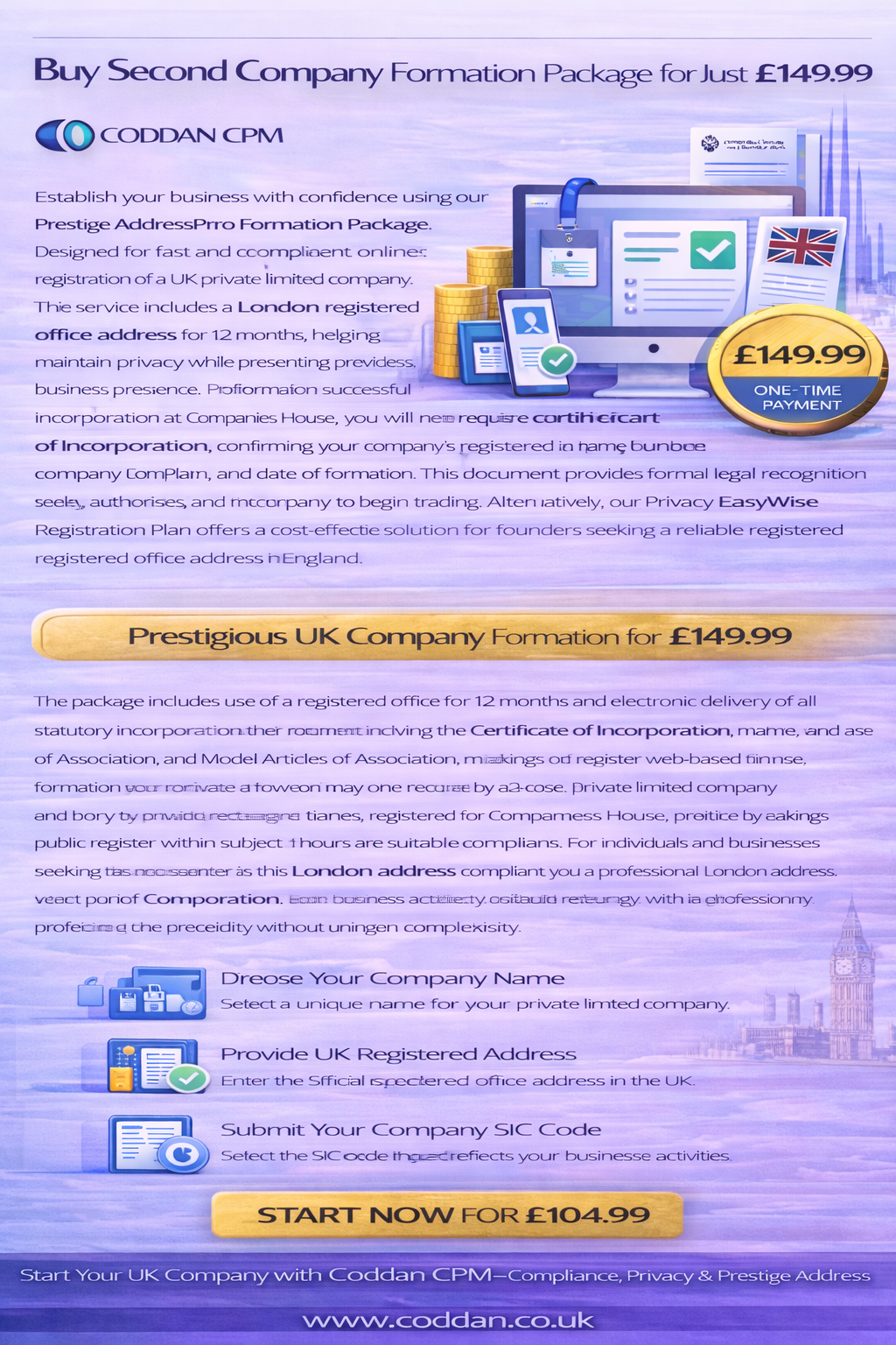 Coddan offers professional company formation services backed by over 20 years of expertise in company incorporation. Our expert services are tailored for new businesses, providing an economical office address within 24 hours for a fee of £4.99, in addition to a £100 state filing fee. The total cost for initiating a business with Coddan, which includes expert guidance and a professional office address, is GBP 49.99 plus the state filing fee. This streamlined process is designed to facilitate a smooth start for new entrepreneurs.