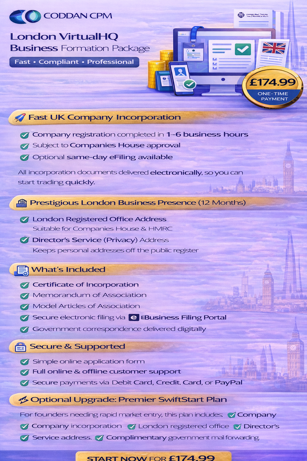 Form your company in the U.K. remotely together with a bank account opening, VAT application and business virtual office address service. If you want to form a company online cheaply, consider using services like Coddan CPM Ltd Formations, which often offer affordable “starter” package that include filing your articles of association for a low price, just be sure to check for extra fees like registered office service or filing reporting costs.