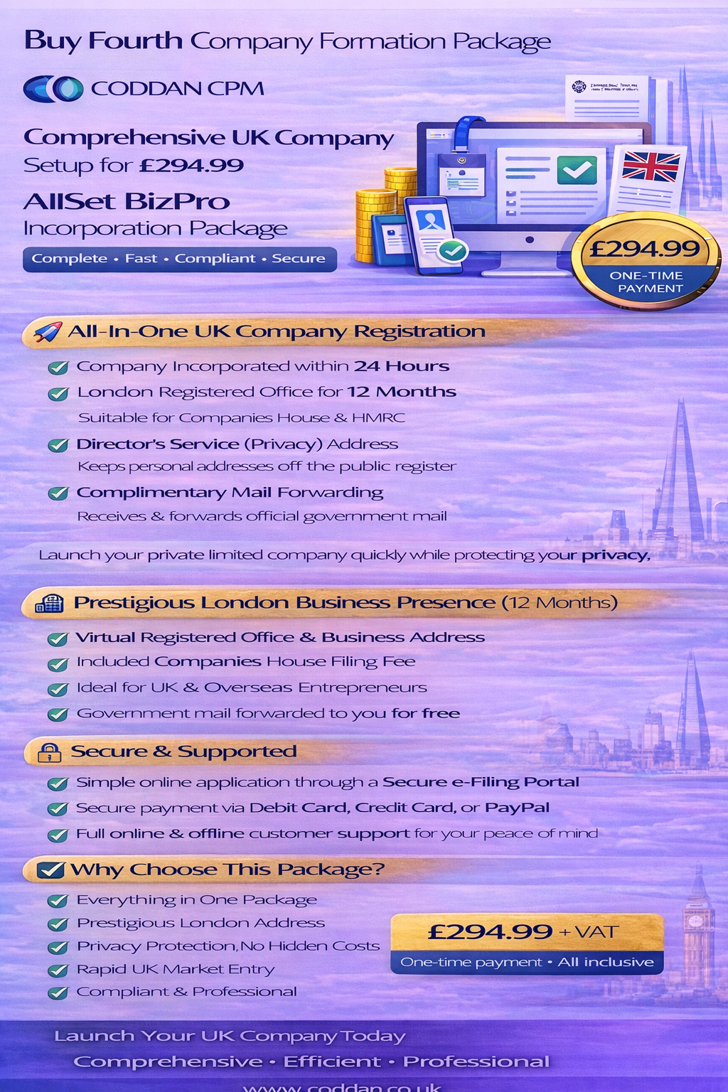 Coddan CPM Ltd as your certified corporate service provider offers eight simplified and good priced electronically formation packages to set up your company in London.