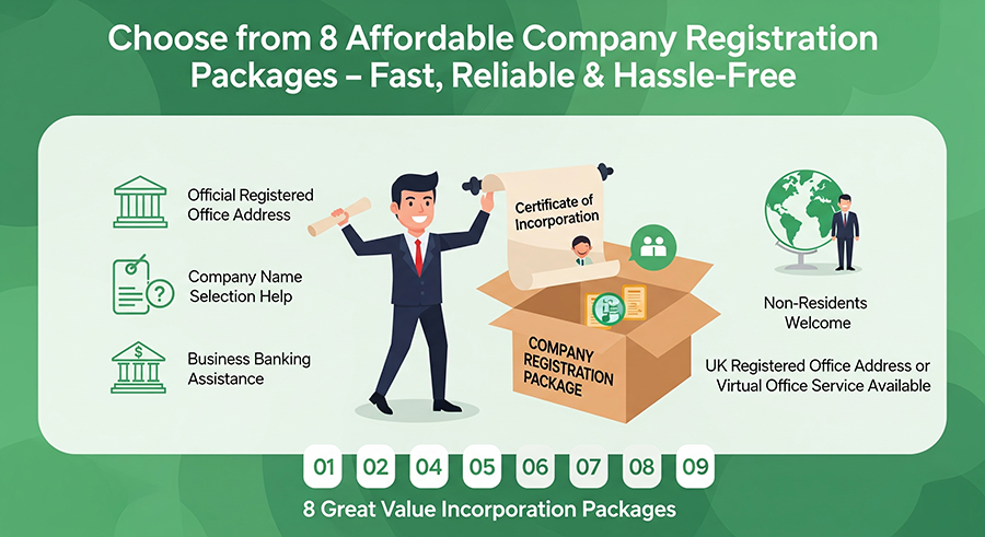 For order and purchase a company incorporation package online in the GB at low-cost, you can use the services of a company formation agent like the Coddan CPM Ltd Formations, where you can typically get a company formation package for £54.99 which includes the CH filing cost, delivering the documents electronically. Simply provide your company name, a registered office address to place an order online, here you will be able to obtain a company registration package, we can prepare and provide all legal required corporate documents for your new business entity quick and easy at low-filing price.